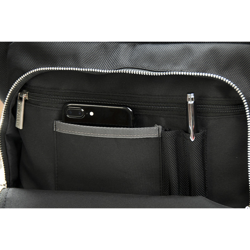 On the front, a rectangular zippered pocket with folded-edge stitching increases storage capacity while maintaining a clean structure. Inside, you’ll find thoughtfully arranged compartments including pen holders, an ID slot, and a secure zippered pocket—keeping small essentials organized and within easy reach. The upper front zip pocket offers generous space, easily fitting a B5-size notebook with room to spare.
