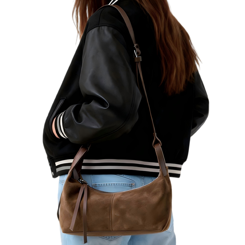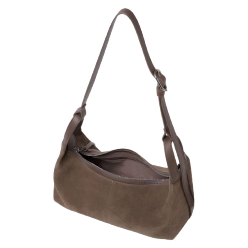 This stylish brown suede dumpling bag combines sleek design with functional elegance. Perfect for everyday wear, it features a unique shoulder strap design and a spacious interior, making it an ideal choice for women who appreciate both fashion and practicality.