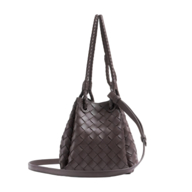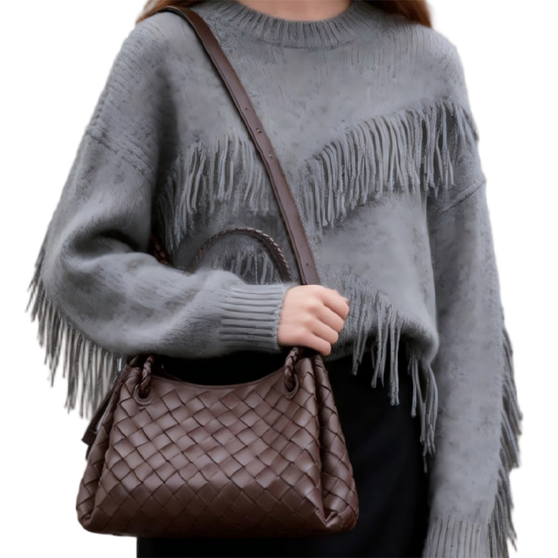 This brown woven leather bag offers a blend of sophistication and functionality, designed for versatility. The bag can easily transition from a shoulder bag to a handbag, featuring a magnetic closure and a unique woven design that makes it stand out.