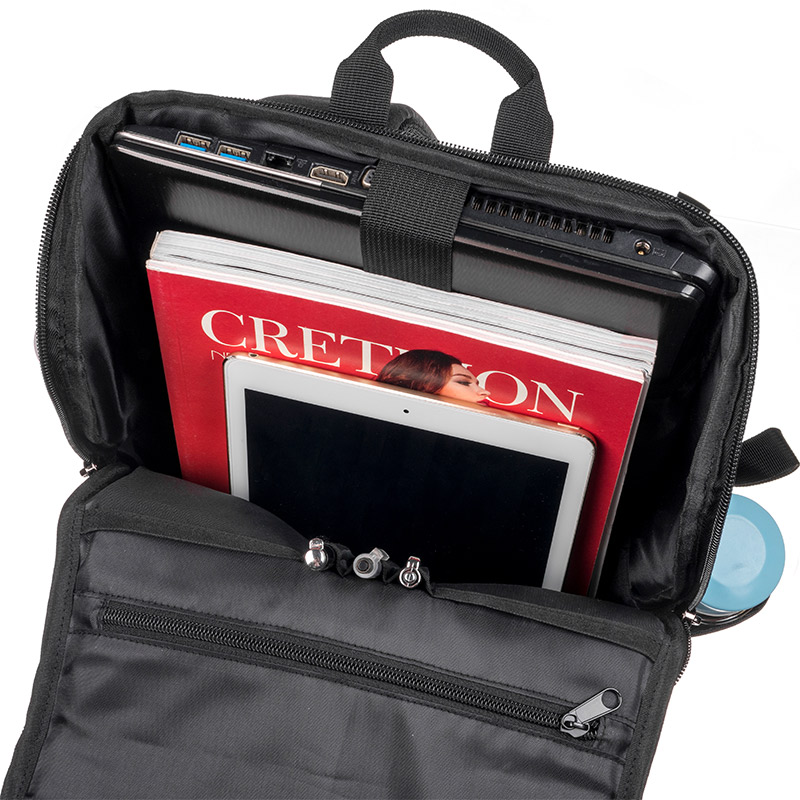 The U-shaped main zipper opens to three-quarters of the bag’s height, allowing wide and convenient access. Its unique structural design enables the backpack to maintain its upright shape without additional support. Inside the top flap, a large zippered pocket provides secure storage. The main compartment includes pen slots, two slip pockets for organized storage, and a padded laptop sleeve positioned along the back panel to protect your computer during commutes. Additionally, a hidden zip pocket on the outer back panel offers a discreet space for cards or small essentials.