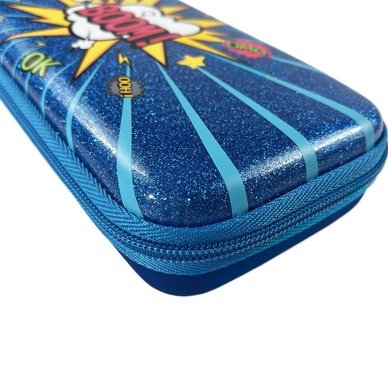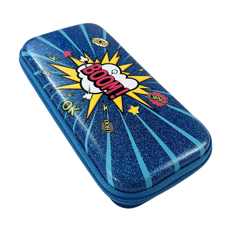 Crafted from durable EVA material, this pencil box is both sturdy and lightweight. The front is adorned with a striking "BOOM!" graphic, designed to grab kids' attention instantly. The back is made from a blue jacquard fabric, complementing the overall design. Inside, the pencil case features a mesh zippered compartment on the lid, perfect for separating smaller items such as erasers, sharpeners, or even pens. The combination of sleek design and practicality makes this a cool pencil case that’s sure to impress.