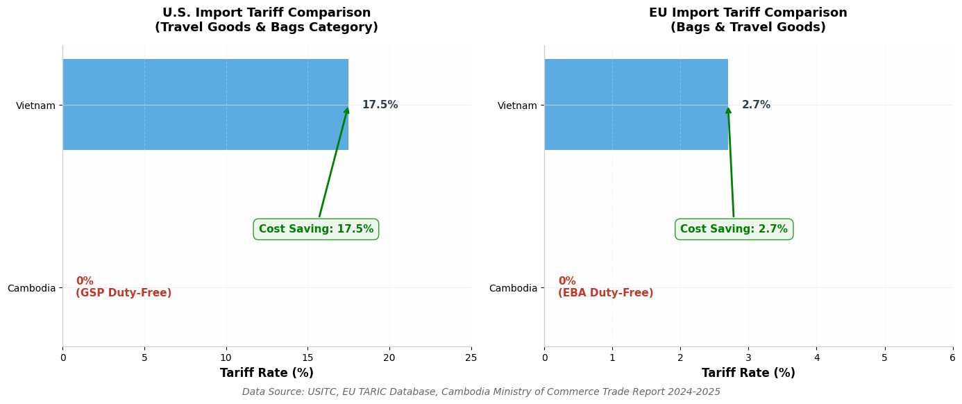 Risk Note: While U.S. GSP policy carries uncertainty (historically intermittent), Cambodian bag manufacturing maintains overall cost competitiveness with Vietnam bag factories even under the 2025 19% tariff scenario, thanks to labor cost advantages. Moreover, EU EBA benefits are guaranteed through at least 2029, providing certainty for mid-to-long-term planning.