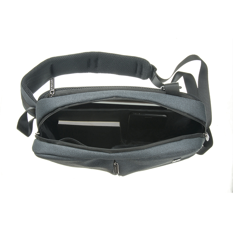 Another distinctive feature is the orientation of the main compartment. Instead of the conventional vertical layout found in many body bag or sling designs, this bag adopts a horizontal main compartment structure. The zipper is equipped with dual pullers, allowing smooth and flexible access from either direction—an example of the attention given to user convenience and product usability.