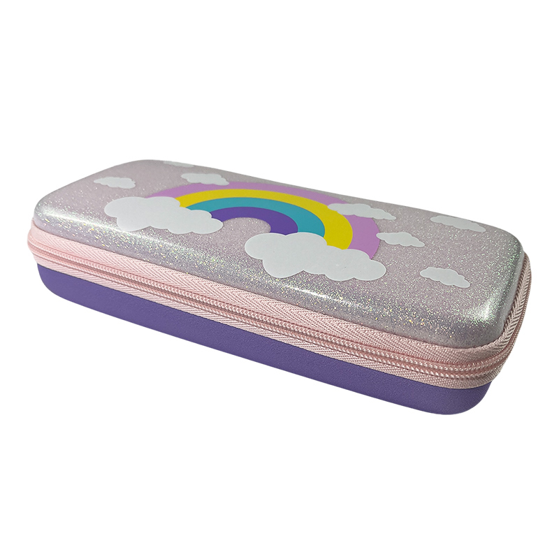0.26 lbCrafted from high-quality EVA material, this pencil box features a shiny pink glitter exterior and a colorful rainbow design that adds a fun element to small girl's school gear. The purple jacquard fabric at the bottom contrasts beautifully with the top, creating a lively, energetic look.