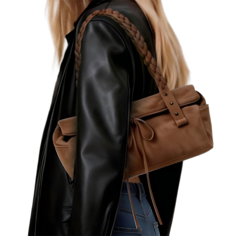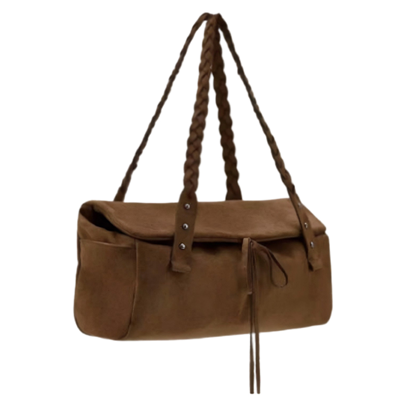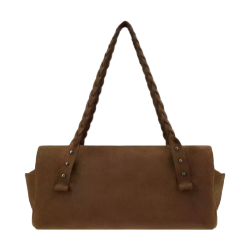This stylish brown suede shoulder bag combines modern design with timeless elegance. With its braided straps and unique buckle accents, this suede bag is a perfect choice for those looking for a chic and versatile accessory for everyday use.