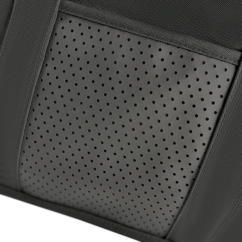 A parte frontal da bolsa inclui um prático bolso de armazenamento feito de tecido EVA perfurado e respirável, conferindo à bolsa uma aparência única e elegante. Este bolso é ótimo para guardar itens de uso frequente, como celular, chaves ou outros pequenos objetos essenciais. No lado esquerdo, há também um bolso de tela para pequenos equipamentos esportivos ou uma garrafa de água, enquanto o lado direito possui um compartimento para sapatos, mantendo seus sapatos extras separados do restante dos seus pertences.