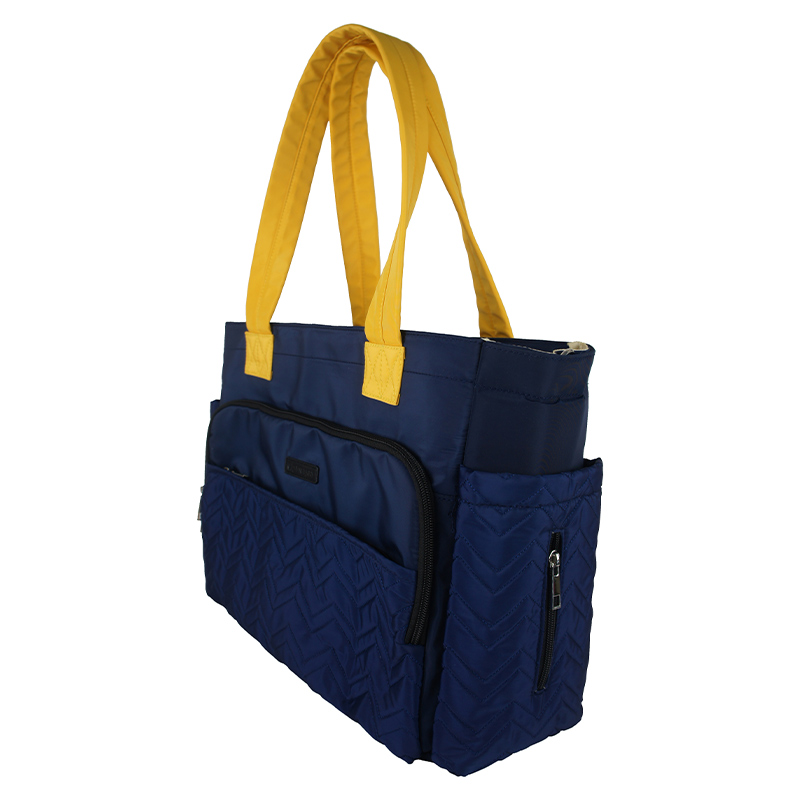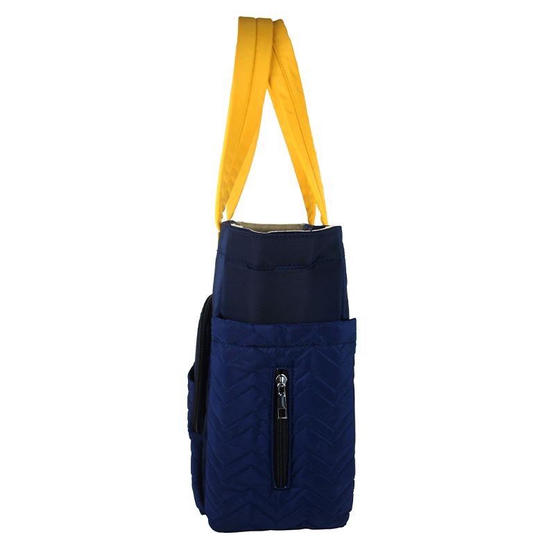 O bolso frontal e os dois bolsos laterais apresentam costura matelassê, adicionando textura e um toque refinado. No painel frontal, há dois bolsos espaçosos com zíper para itens de uso frequente. O bolso do lado direito funciona como um porta-lenços, com zíper vertical para acesso rápido e prático. Um bolso com zíper no painel traseiro oferece armazenamento seguro para pertences pessoais.