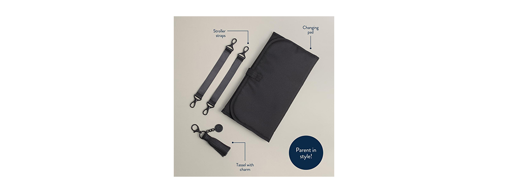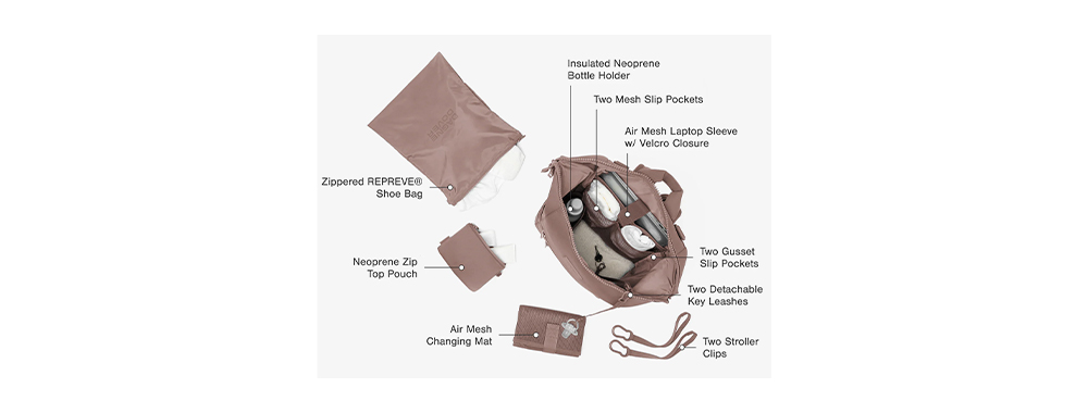 Recurso adicional 2: Cada mochila para fraldas Dagne Dover Indi vem com um trocador de fraldas reciclado REPREVE®, uma bolsa para sapatos e um saco de proteção contra poeira.