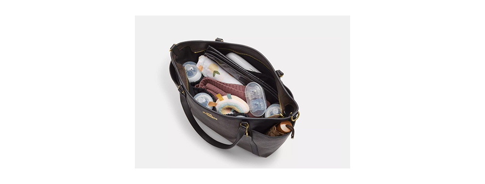 • Layout interno e capacidade: A bolsa de bebê da Coach prioriza um design limpo e simples, com aproveitamento eficiente do espaço. Geralmente, possui um amplo compartimento principal que comporta fraldas, roupas, cobertores pequenos e outros itens, além de diversos bolsos adicionais para organizar objetos menores com mais facilidade.