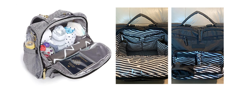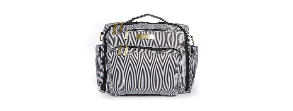 Layout interno e capacidadeA BFF é um dos maiores modelos da JuJuBe, com um interior projetado como uma caixa de ferramentas bem organizada, apresentando mais de uma dúzia de bolsos funcionais. Inclui vários bolsos térmicos para mamadeiras (geralmente de 3 a 4, mantendo as mamadeiras aquecidas por até 4 horas), um compartimento específico para fraldas sujas, um gancho para chaves, um bolso para celular, um bolso para lenços umedecidos, um bolso multifuncional em tela, elásticos e muito mais.
