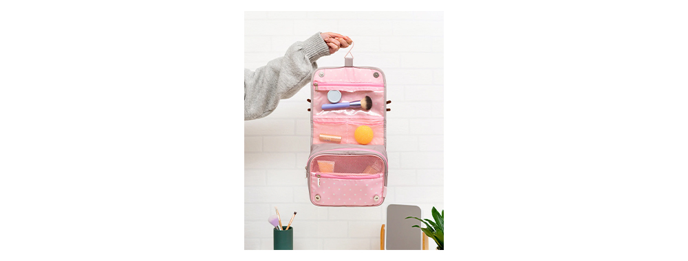 As bancadas dos banheiros de hotéis têm, em média, menos de 0,5 metros quadrados. Nosso porta-maquiagem suspenso, com gancho metálico giratório de 360°, transforma o espaço vertical em armazenamento organizado.